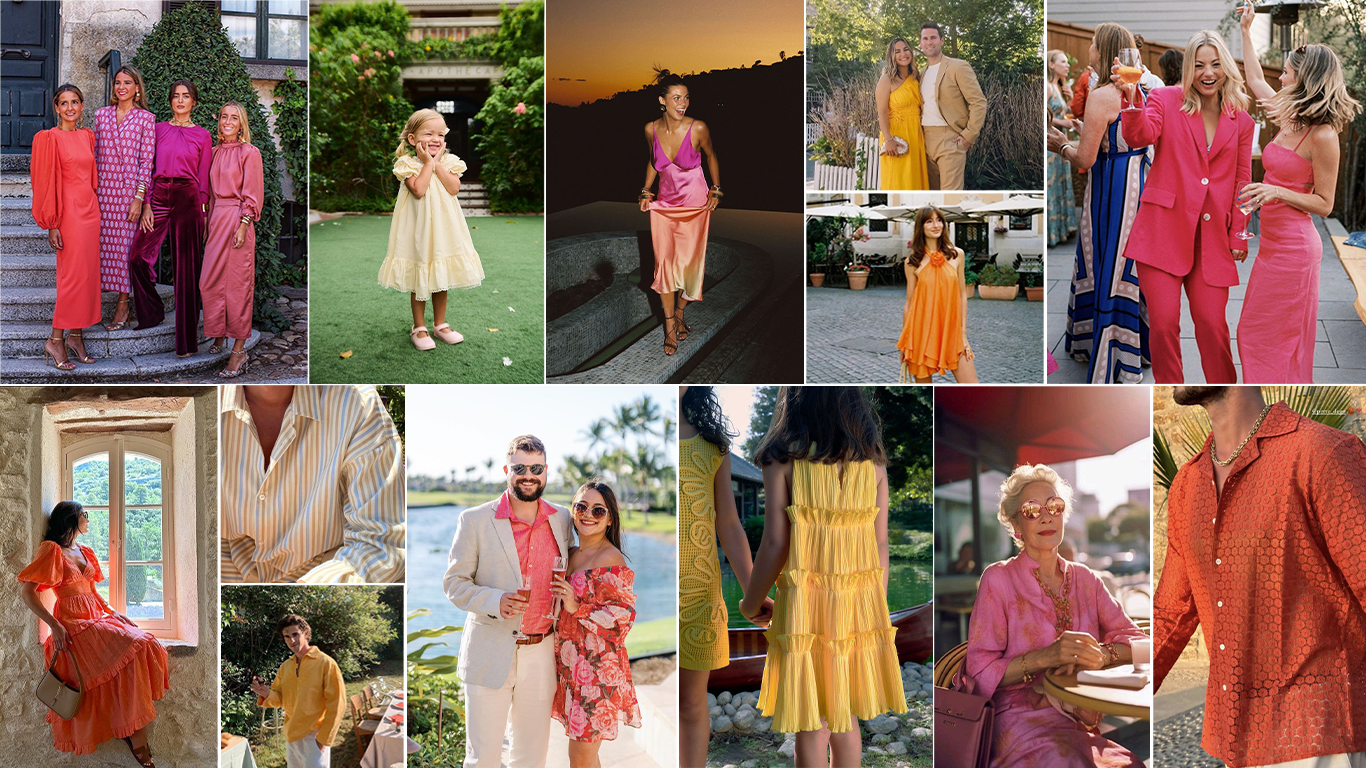 Attire: Cocktail in warm sunset shades; block heels, wedges, or flats recommended for the outdoor setting. Think oranges, pinks, blushes, and golds… ideas below!